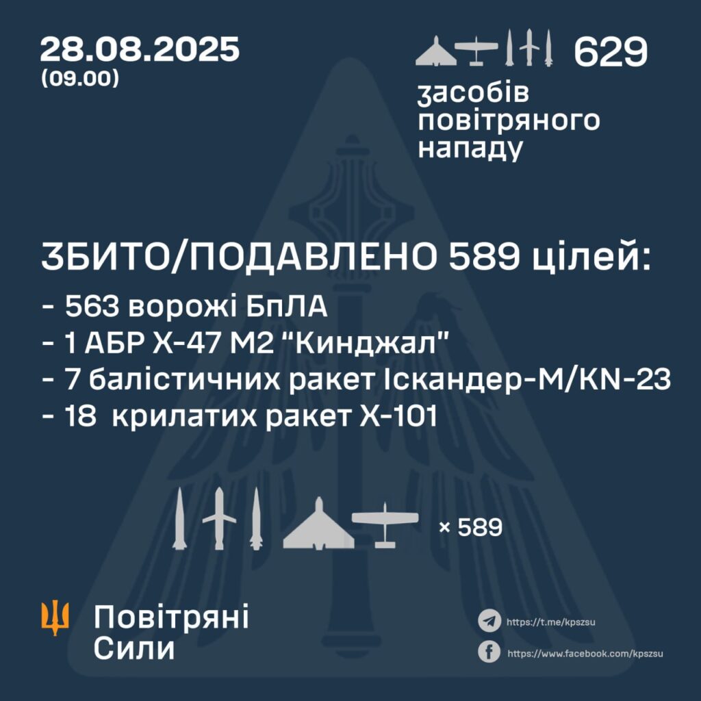 У ніч на 28 серпня (із 19.30 27 серпня) противник завдав масованого удару по території України із застосуванням ударних БпЛА, ракет повітряного та наземного базування, загалом – 629 засобів повітряного нападу: