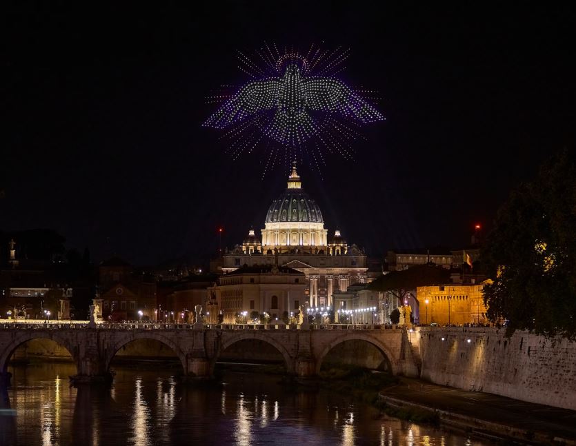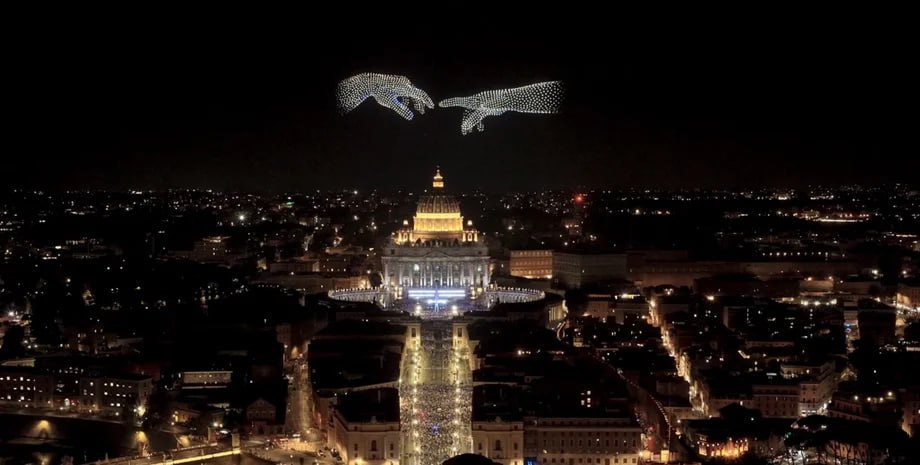 Сотні дронів тим часом відтворювали тривимірне серце, голубів миру, знаменитий дотик пальця Бога, який створив Адама, портрет покійного Папи Франциска тощо.
