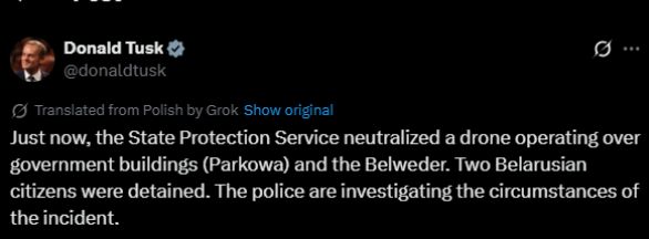 Над урядовою будівлею Польщі знищили безпілотник. Затримали двох громадян Білорусі, — повідомив Туск.