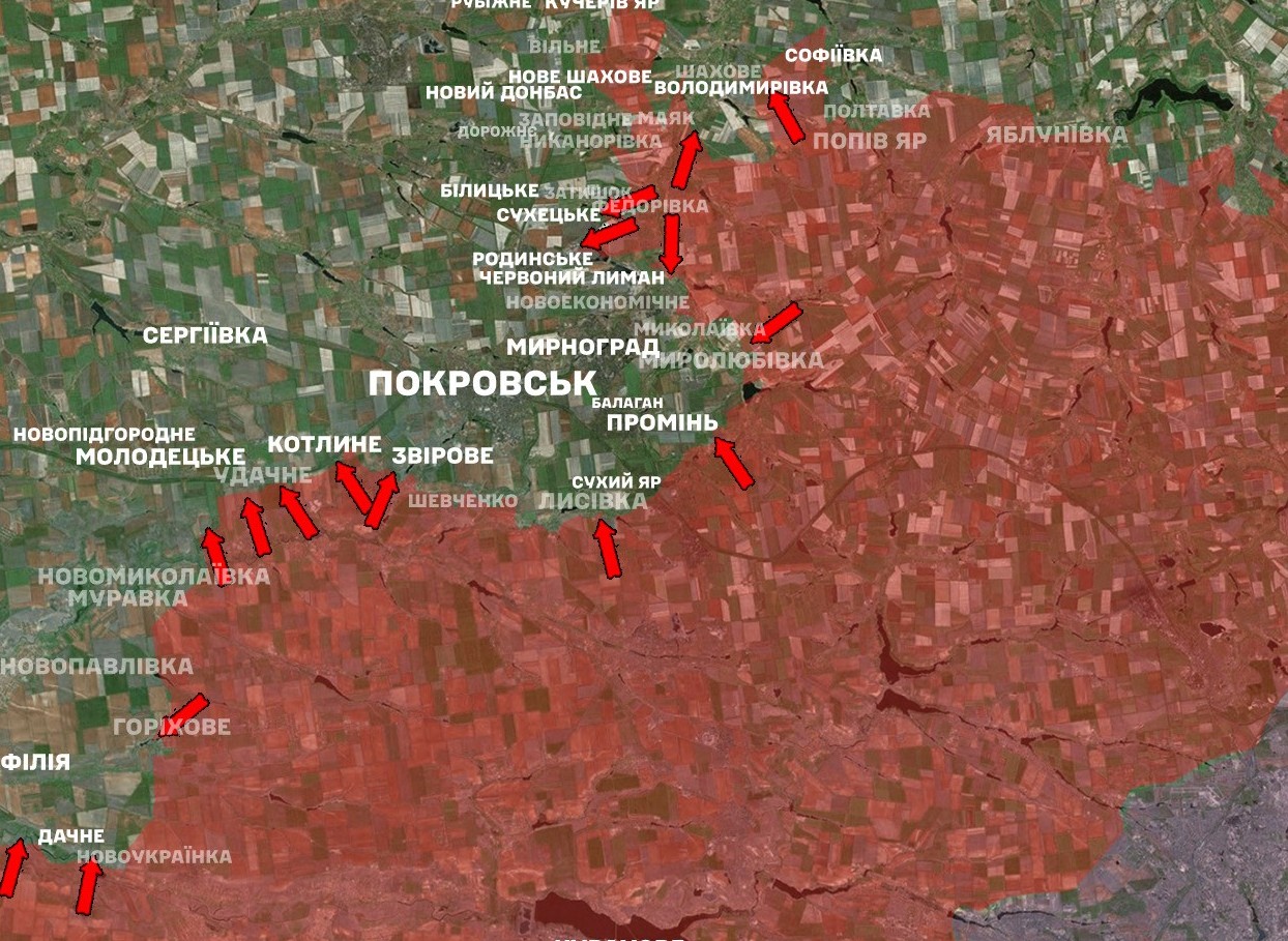 На Покровському напрямку наші захисники зупинили 69 штурмових і наступальних дій агресора у районах населених пунктів Володимирівка, Никанорівка, Золотий Колодязь, Новоекономічне, Шахове, Лисівка, Муравка, Звірове, Молодецьке, Родинське, Миролюбівка, Промінь, Новоукраїнка, Нове Шахове та в напрямках Покровська, Новопавлівки й Нового Донбасу.