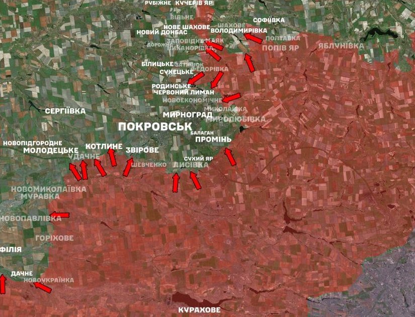 На Покровському напрямку відбулося 52 боєзіткнення у районах населених пунктів Володимирівка, Никанорівка, Родинське, Червоний Лиман, Новоекономічне, Котлине, Удачне, Молодецьке, Дачне, Нове Шахове, Лисівка, Звірове, Новоукраїнка та у бік населених пунктів Покровськ, Козацьке і Новопавлівка.