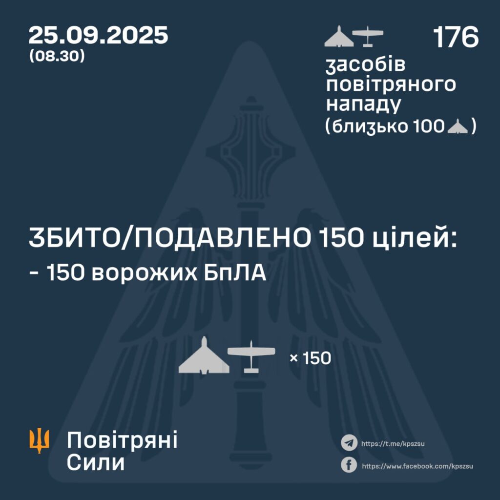 У ніч на 25 вересня (із 18.00 24 вересня) противник атакував 176-ма ударними БпЛА типу Shahed, Гербера і безпілотниками інших типів із напрямків: Курськ, Орел, Міллєрово, Приморсько-Ахтарськ – рф., Чауда – ТОТ Криму, близько 100 із них – шахеди.