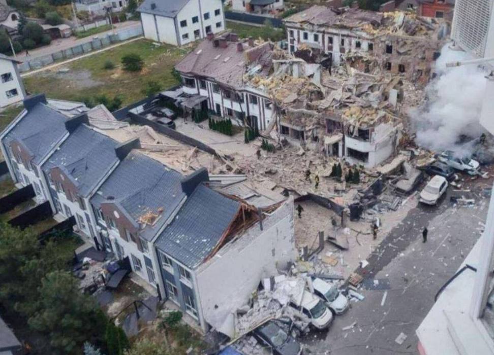 У Солом’янському районі частково зруйнований 5-поверховий будинок, рятувальники деблокують виявлене тіло жінки. Спалахнула пожежа на 3-4 поверхах державного медзакладу. Уламки впали на приватну садибу й нежитлову забудову.