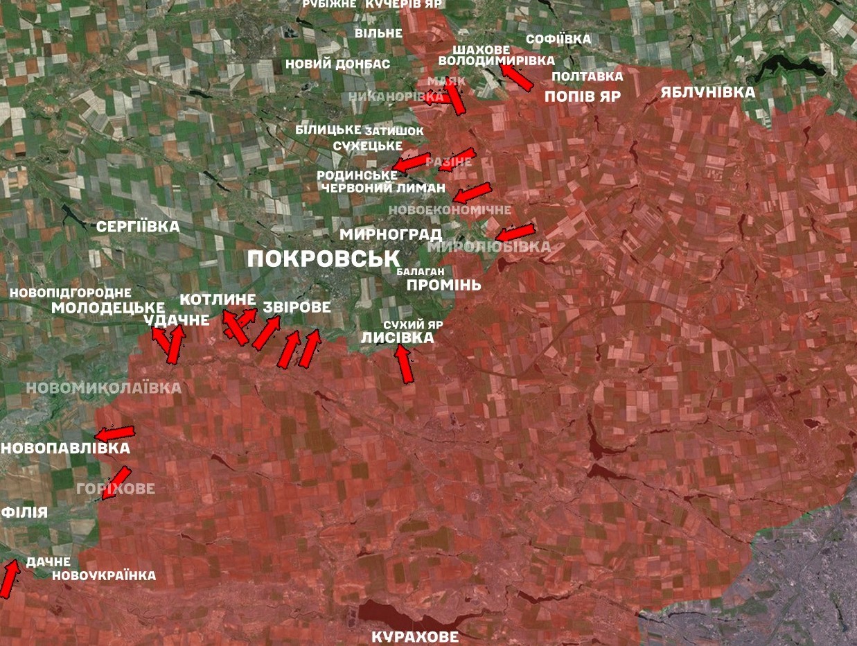 На Покровському напрямку наші захисники зупинили 59 атак агресора у районах населених пунктів Никанорівка, Маяк, Родинське, Червоний Лиман, Разіне, Новоекономічне, Миролюбівка, Лисівка, Покровськ, Звірове, Котлине, Удачне, Горіхове, Філія та у бік Новопавлівки й Володимирівки.