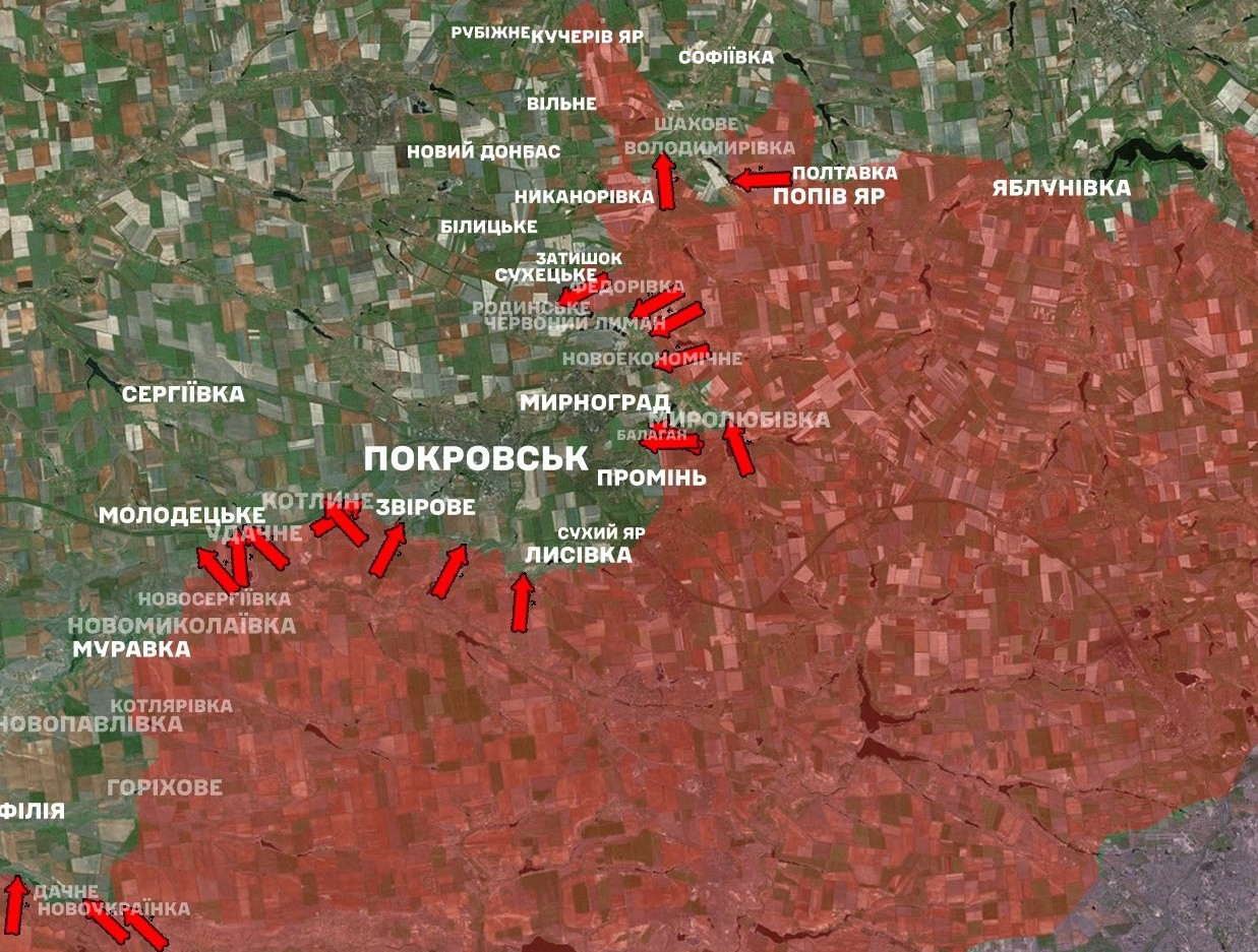 На Покровському напрямку наші захисники зупинили 65 наступальних дій агресора у районах населених пунктів Володимирівка, Червоний Лиман, Мирноград, Родинське, Новоукраїнка, Новоекономічне, Балаган, Покровськ, Звірове, Котлине, Удачне, Молодецьке, Миролюбівка, Дачне, Філія та в напрямку Новопавлівки.