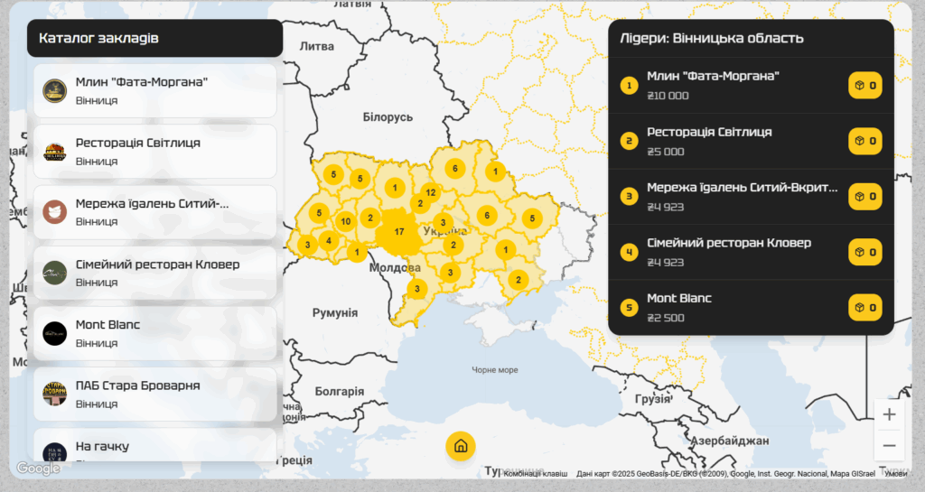 Натепер у лідерах — Вінниччина із 17 закладами, Київщина із 15 закладами та Тернопільщина із 10 закладами. Також у Полтаві приєдналося 4 заклади, у одного із яких 13 точок по місту (було 5, проте один із закладів від’єднався через певні економічні обставини).