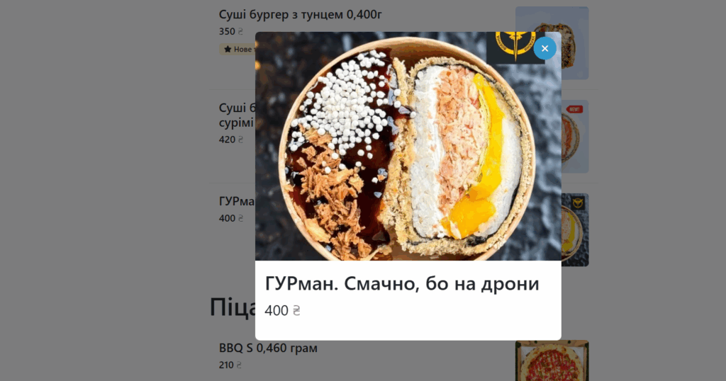Сушібургер “ГУРман” у Bluefin delivery. Знімок екрана