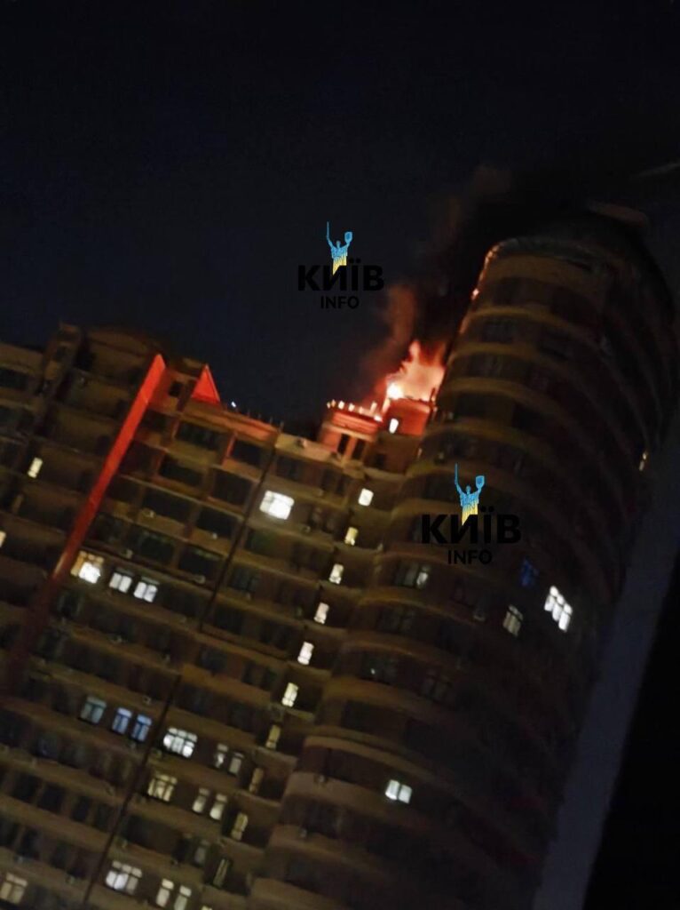 також влучання в 17-ти поверховий житловий будинок. Загорання на рівні 14-15 поверхів.
