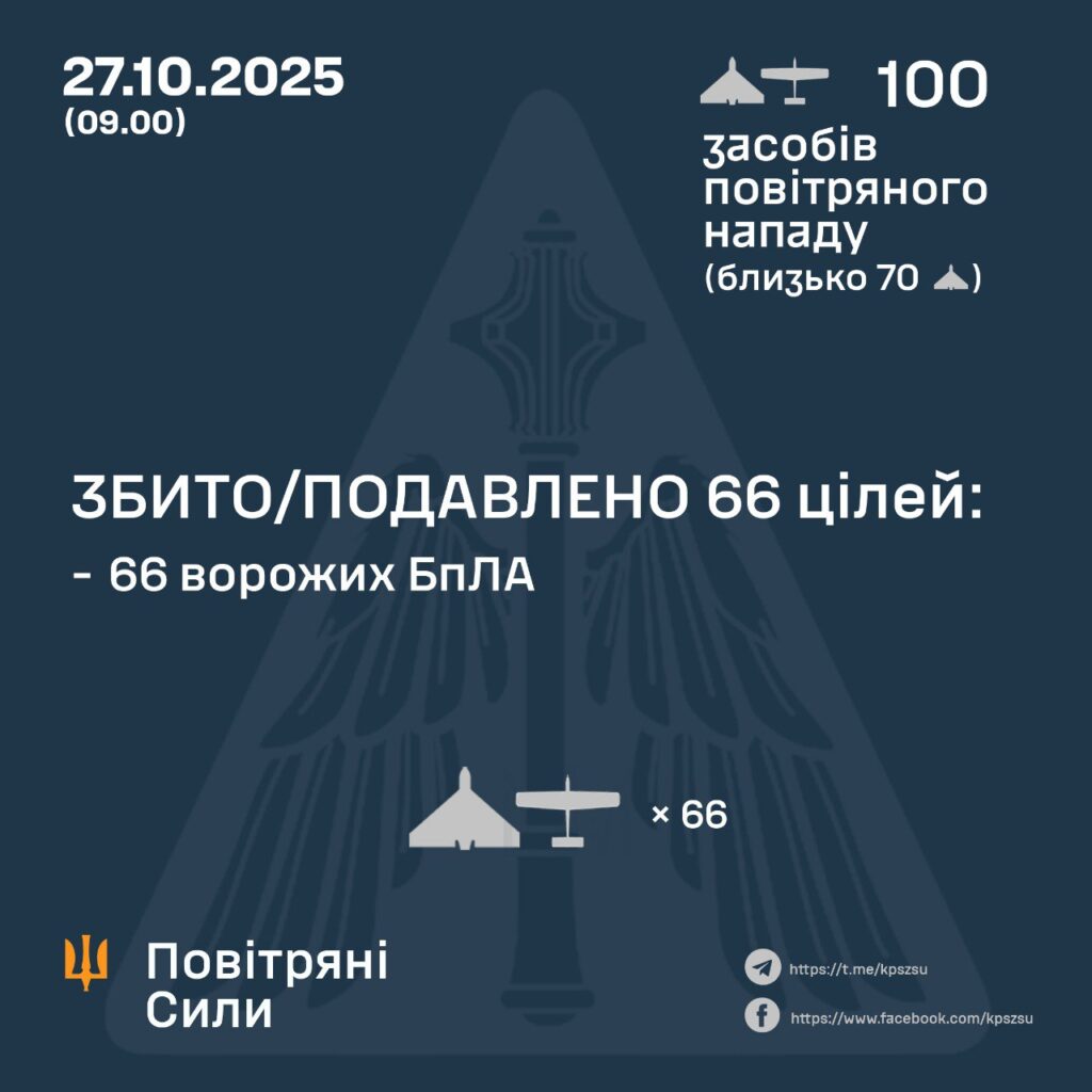 У ніч на 27 жовтня (з 18:30 26 жовтня) противник атакував 100 ударними БпЛА типу Shahed, Гербера і безпілотниками інших типів із напрямків: Курськ, Орел, Приморсько-Ахтарськ – рф, близько 70 із них – “шахеди”.