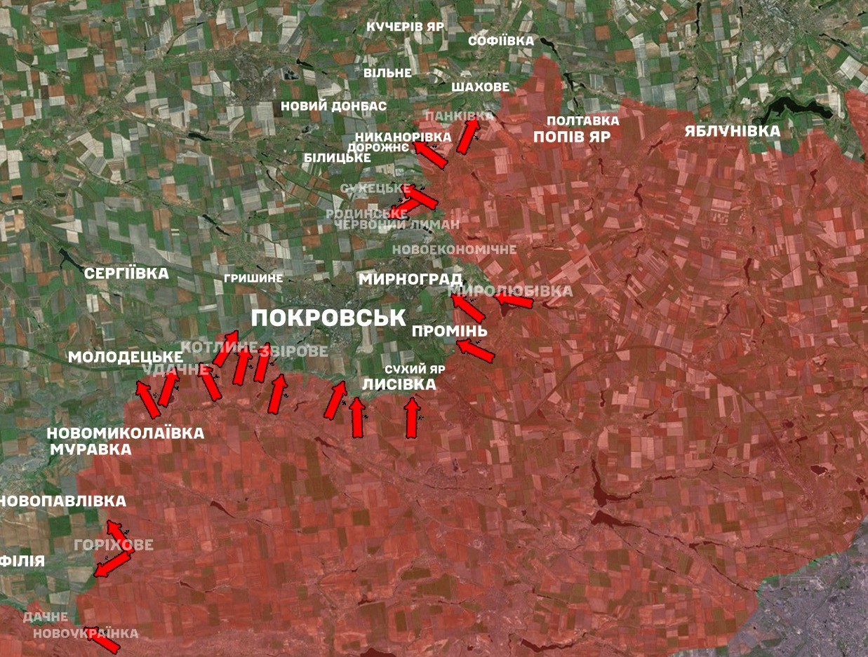 На Покровському напрямку наші захисники зупинили 79 штурмів агресора у районах населених пунктів Никанорівка, Панківка, Сухецьке, Родинське, Миролюбівка, Промінь, Лисівка, Покровськ, Звірове, Молодецьке, Котлине, Удачне, Новоукраїнка та Горіхове.