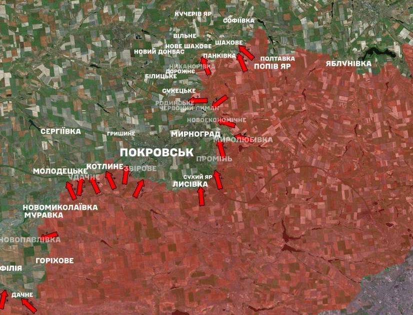 На Покровському напрямку наші захисники зупинили 45 штурмових дій агресора у районах населених пунктів Шахове, Нове Шахове, Червоний Лиман, Родинське, Новоекономічне, Лисівка, Новопавлівка, Покровськ, Миролюбівка, Мирноград, Звірове, Котлине, Удачне, Молодецьке, Дачне, Філія.
