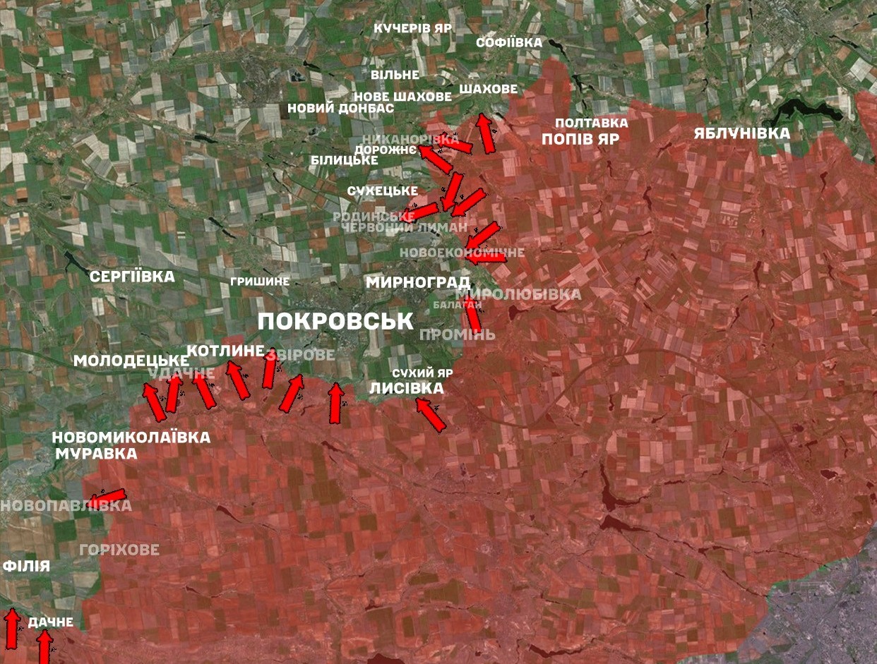 На Покровському напрямку наші захисники зупинили 55 штурмових дій агресора у районах населених пунктів Шахове, Дорожнє, Никанорівка, Родинське, Звірове, Котлине, Молодецьке, Удачне, Новопавлівка, Новоекономічне, Червоний Лиман, Мирноград, Балаган, Лисівка, Покровськ, Філія, Кучерів Яр, Дачне.