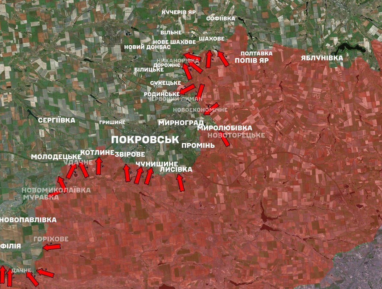 На Покровському напрямку наші захисники зупинили 48 штурмових дій агресора у районах населених пунктів Шахове, Никанорівка, Новоторецьке, Родинське, Новоекономічне, Чунишине, Покровськ, Звірове, Котлине, Удачне, Молодецьке, Новомиколаївка та Філія.