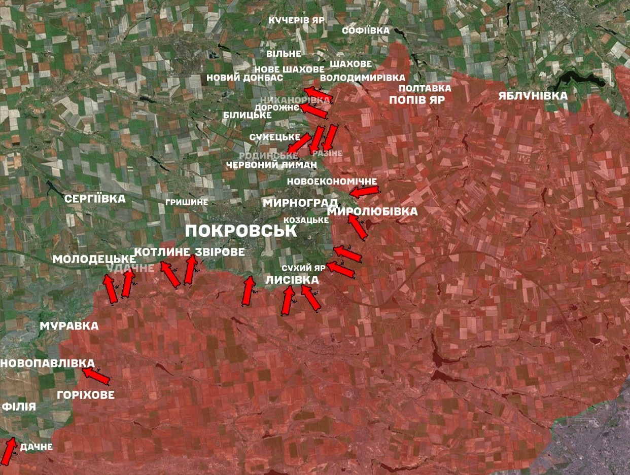 На Покровському напрямку наші захисники зупинили 58 штурмових дій агресора у районах населених пунктів Червоний Лиман, Федорівка, Шахове, Мирноград, Никанорівка, Родинське, Дорожнє, Новопавлівка, Новоекономічне, Лисівка, Покровськ, Котлине, Удачне, Молодецьке, Філія.