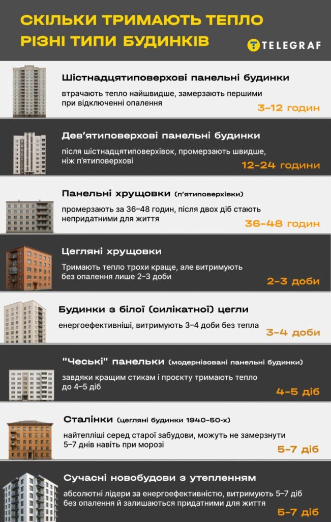 Які типи будинків замерзнуть першими під час можливих блекаутів, скільки часу різні споруди протримаються без опалення і чому товщина стін — далеко не єдиний фактор виживання у холодну зиму, розбирався “Телеграф”.