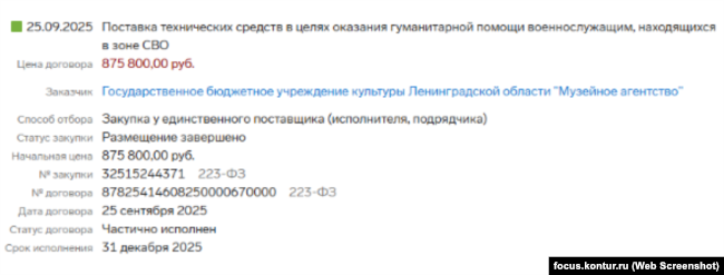 Нарешті, у вересні 2025 року «постачання технічних засобів з метою надання гуманітарної допомоги військовослужбовцям, які перебувають у зоні «СВО», оплатило на суму 875 тисяч рублів «Музейне агентство» – організація, що управляє трьома десятками невеликих музеїв у Ленінградській області (Ладозька фортеця, фортеця в Івангороді, будиночок няні Пушкіна та інші). Як і у випадку з Виборзьким музеєм, публічно ці постачання ніде не згадувалися.