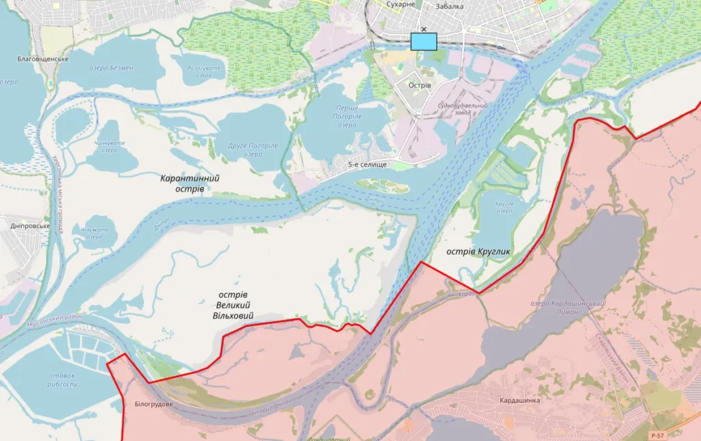 Росіяни хочуть захопити Карантинний острів, проте на їх картах до його складу також відноситься район Херсону Корабел / Скриншот з UAControlMap