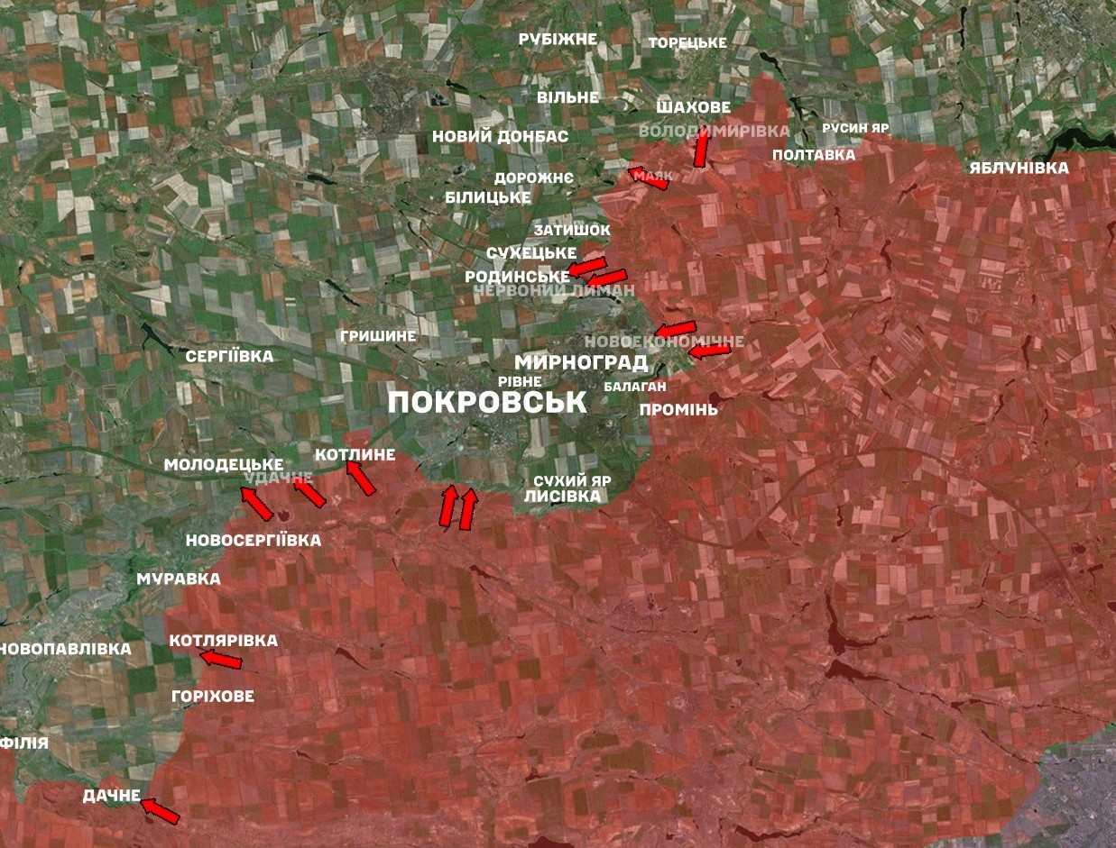 На Покровському напрямку наші захисники зупинили 52 штурмові дії агресора у районах населених пунктів Володимирівка, Маяк, Родинське, Червоний Лиман, Новоекономічне, Покровськ, Котлине, Удачне, Молодецьке, Дачне та у бік Новопавлівки.