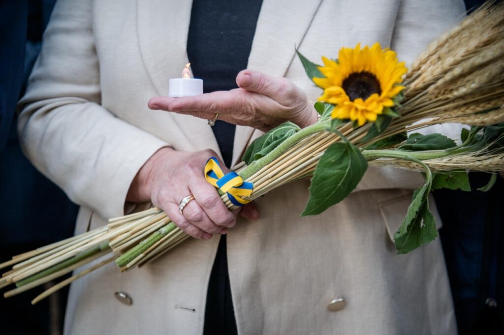 Піднята рука перед розбитим жорном символізує приголомшливий тягар пам’яті і глибоку віру в оновлення та зцілення. У руці п’ять колосків зерна, що нагадують про жорстокий кремлівський закон, згідно з яким зберігання будь-якої кількості врожаю каралося смертю.