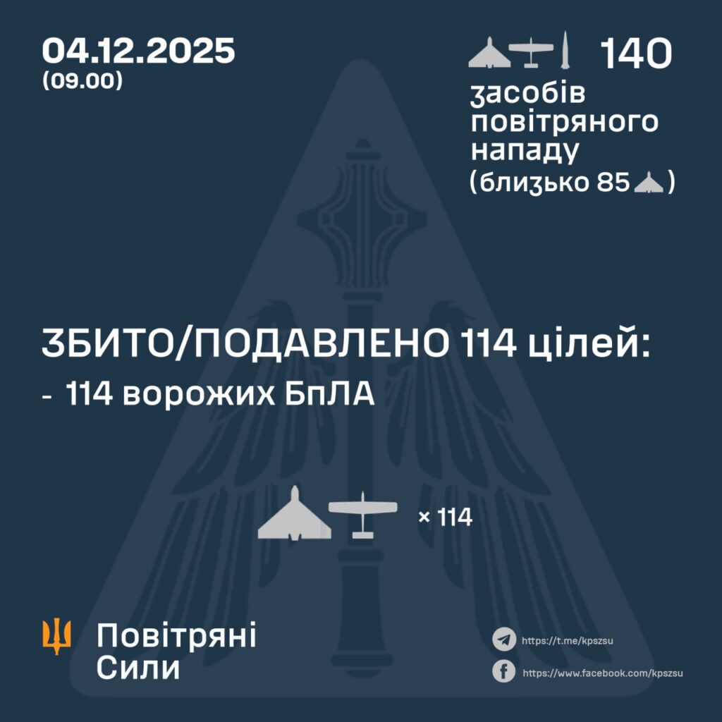 У ніч на 04 грудня (з 18:00 03 грудня) противник атакував двома балістичними ракетами Іскандер-М із Ростовської області – рф та ТОТ АР Крим, а також 138-ма ударними БпЛА типу Shahed, Гербера і безпілотниками інших типів із напрямків: Орел, Курськ, Міллєрово, Приморсько-Ахтарськ, Брянськ – рф, Чауда – ТОТ АР Крим, близько 85 із них – “шахеди”.