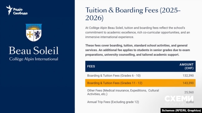 Син колишнього міністра юстиції та енергетики Германа Галущенка вже четвертий рік поспіль вчиться в одному з найдорожчих приватних коледжів Європи – College Alpin Beau Soleil у Швейцарії, де вартість навчання разом із проживанням сягає до 200 тисяч доларів на рік.