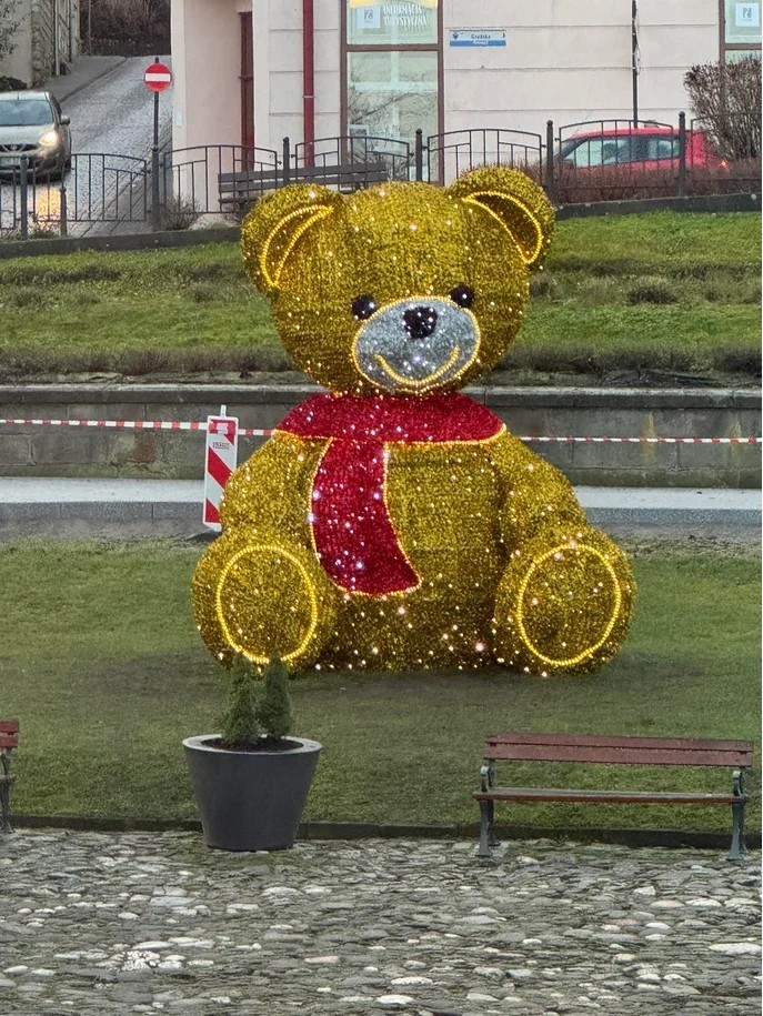 У Перемишлі, що на південному сході Польщі, перед Різдвом установили святкову інсталяцію у вигляді золотого ведмедя із синім шарфом. Проте така колірна гама викликала бурхливе обговорення в соціальних мережах через асоціацію з Україною. Зрештою, місту довелося замінити фрагмент прикраси.