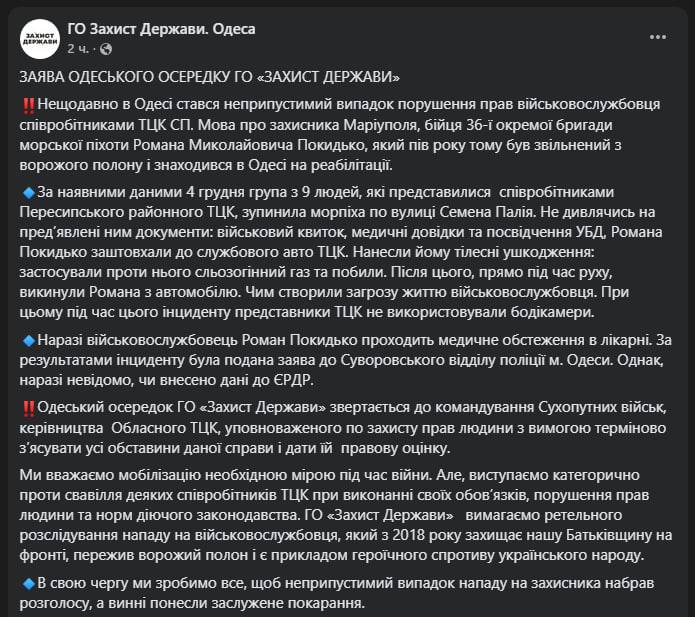 В Одесі 4 грудня група оповіщення Пересипського районного ТЦК зупинила бійця 36-ї бригади морської піхоти Романа Покидько, який пів року тому був звільнений з полону, а в Одесі перебував на реабілітації, повідомили в ГО “Захист Держави”.