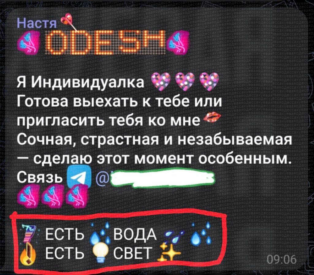 Пишуть також, що одеські проститутки почали вказувати в своїх запрошеннях наявність світла і води.