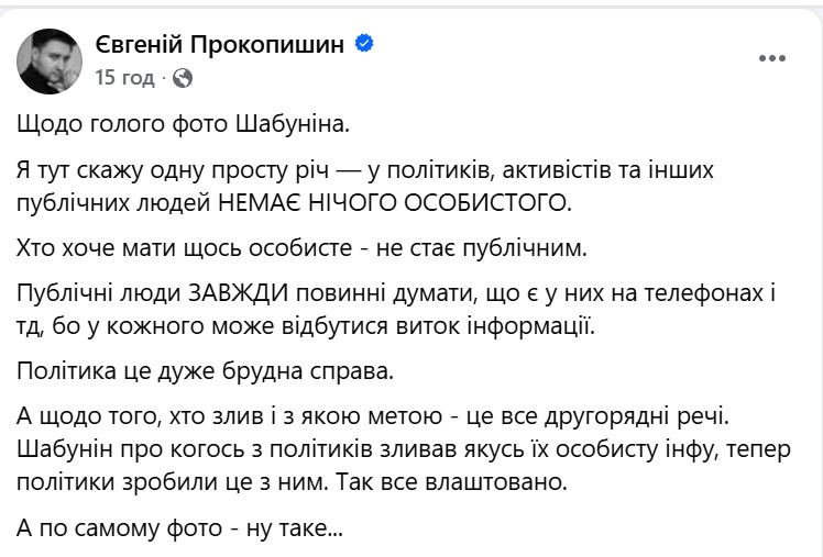 Мушу визнати, що публікація інтимних фото з вилученого при обшуку телефону – це нове дно, яке Зеленський пробив разом зі своїми силовиками”, – написав Шабунін, якого весь час переслідують скандали.