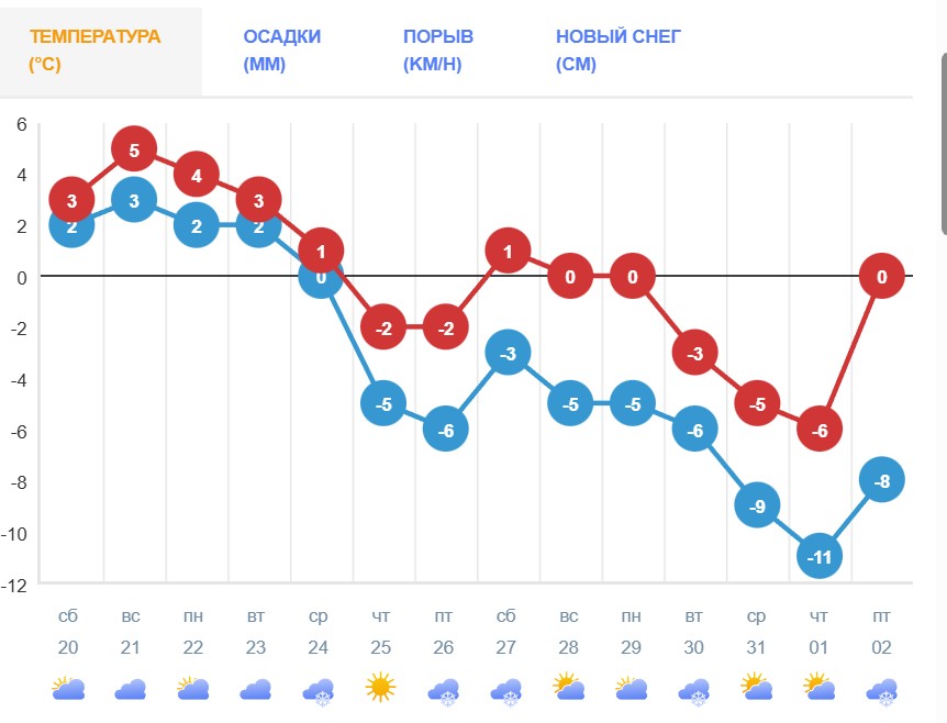 26–29 грудня температурний режим стабілізується на рівні -1°…+1°C вдень та -3°…-6°C вночі. Можлива ожеледиця на дорогах.