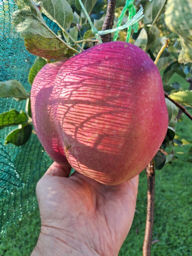 -Юрію вдалося виростити не просто велетня, а яблуко-гіганта вагою 1кг 281г. Обхват плода – 50 см! Мабуть, якби цей вирощений ним яблукозавр упав, певно сейсмологи би зафіксували землетрус ))). Тож щоб гілка дерева витримала таку вагу, довелося використовувати підв’язки і з усіх боків ставити підпори.