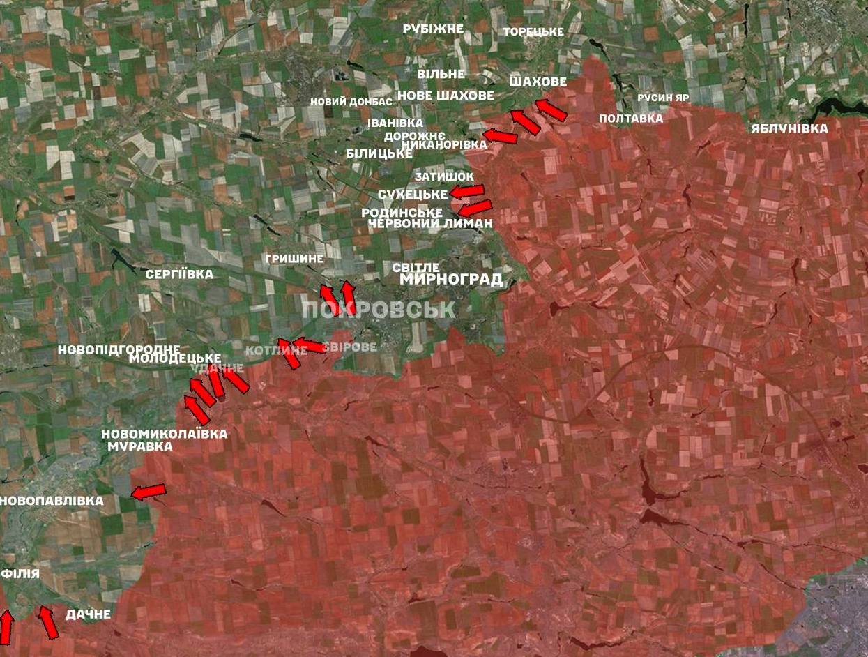 На Покровському напрямку відбулося 57 бойових зіткнень у районах населених пунктів Шахове, Родинське, Сухецьке, Покровськ, Котлине, Удачне, Молодецьке, Філія та у бік Гришиного, Дорожнього, Новопідгороднє, Сергіївки, Нового Шахового й Новопавлівки.