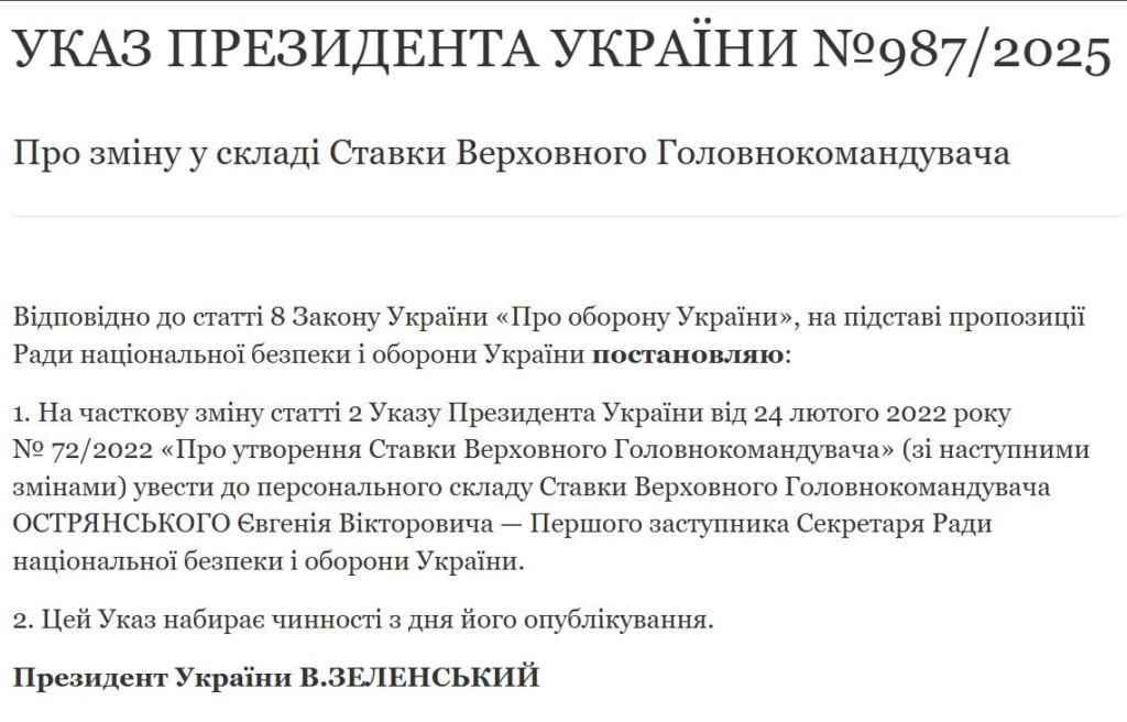Президент Зеленський увів до персонального складу Ставки верховного головнокомандувача генера-майора Євгенія Острянського.