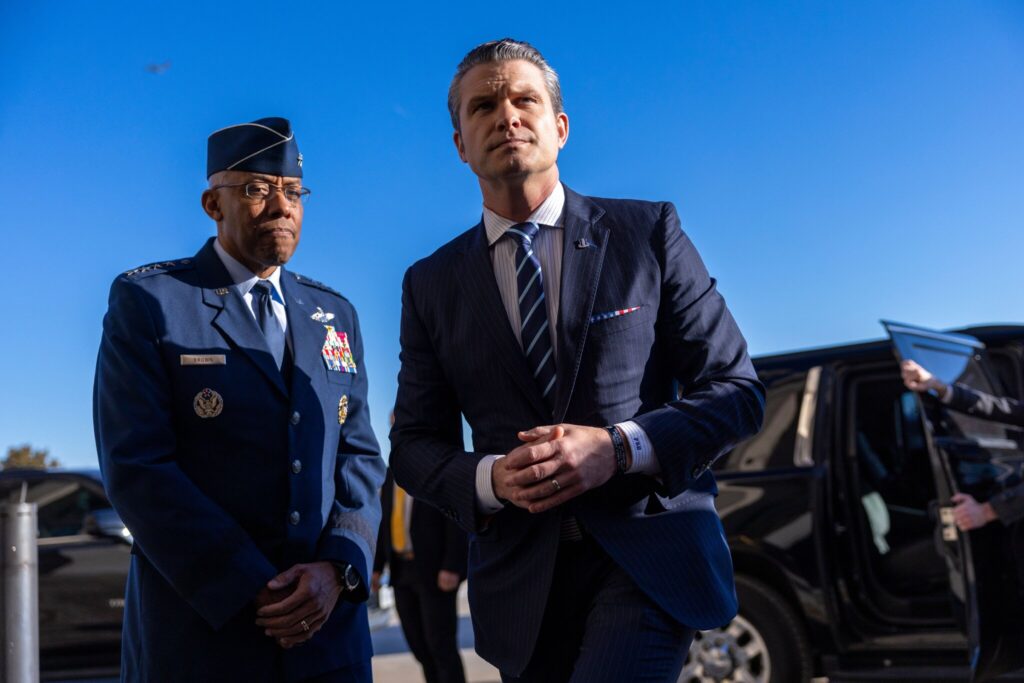 Генерал Чарльз К. Браун-молодший, тоді голова Об’єднаного комітету начальників штабів, ліворуч, з Пітом Хегсетом у його перший офіційний день як міністра оборони в січні. Shawn Thew/EPA, via Shutterstock