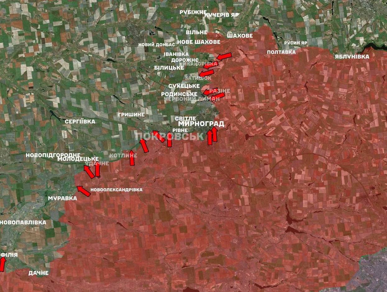 На Покровському напрямку наші захисники зупинили 47 штурмових дій агресора в районах населених пунктів Затишок, Родинське, Червоний Лиман, Мирноград, Покровськ, Котлине, Удачне, Молодецьке, Никанорівка та у бік Новопавлівки, Новоолександрівки, Гришиного, Сергіївки, Білицького та Філії.