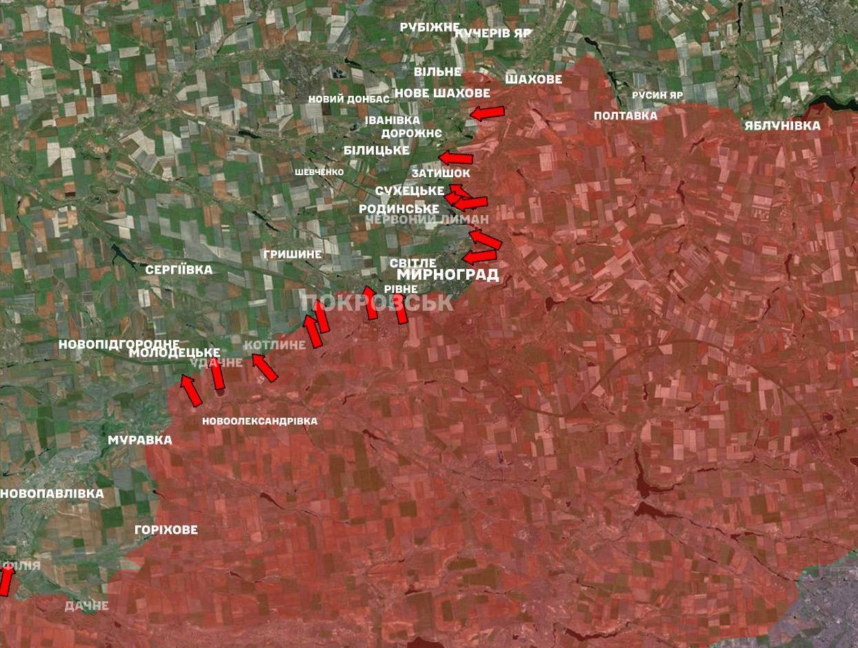На Покровському напрямку наші захисники зупинили 44 штурмові та наступальні дії агресора у районах населених пунктів Покровськ, Мирноград, Родинське, Котлине, Удачне, Молодецьке, Філія та у бік населених пунктів Білицьке, Дорожнє, Шевченко, Гришине, Іванівка.