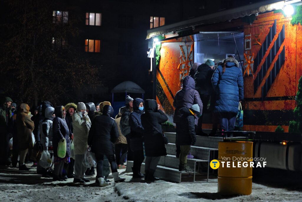 У фудтраку працює генератор, можна зарядити телефон. На вулиці до фургону вишикувалася черга, мешканці району приносять скляні банки, щоби взяти гаряче питво для когось ще. Люди переважно похилого віку.