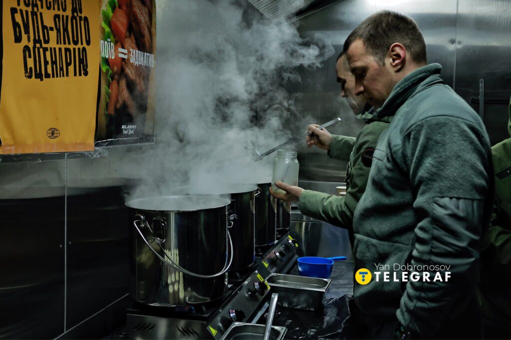 У ряд стоять великі каструлі, в яких кип’ятиться вода і вариться бульйон. Усередині висить плакат із девізом: “Годуємо для будь-якого сценарію”.