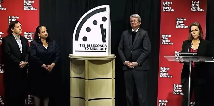 Щорічна церемонія переведення символічного хронометра відбулася 27 січня о 10 за східним часом (о 17 за Києвом). Вчені проаналізували безпекову ситуацію в світі й вирішили перевести Годинник на 85 секунд до опівночі. Своє рішення вони мотивували напруженістю в геополітичній обстановці, кліматичними викликами, а також поширенням штучного інтелекту.