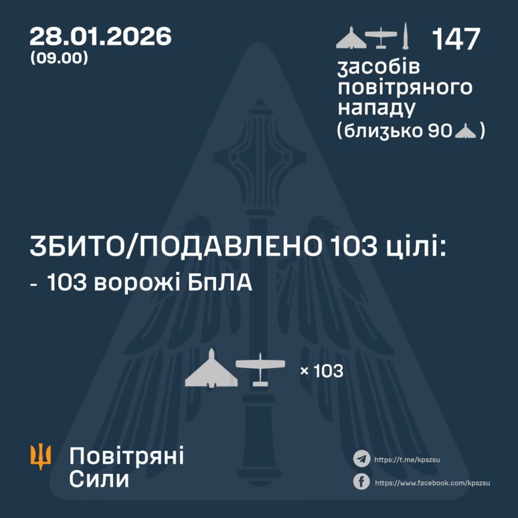 У ніч на 28 січня (з 18:00 27 січня) противник атакував балістичною ракетою Іскандер-М із Ростовської обл., а також 146 ударними БпЛА типу Shahed, Гербера, Італмас та безпілотниками інших типів із напрямків: Курськ, Орел, Приморсько-Ахтарськ – рф., Чауда, Гвардійське – ТОТ АР Крим, близько 90 із них – “шахеди”.