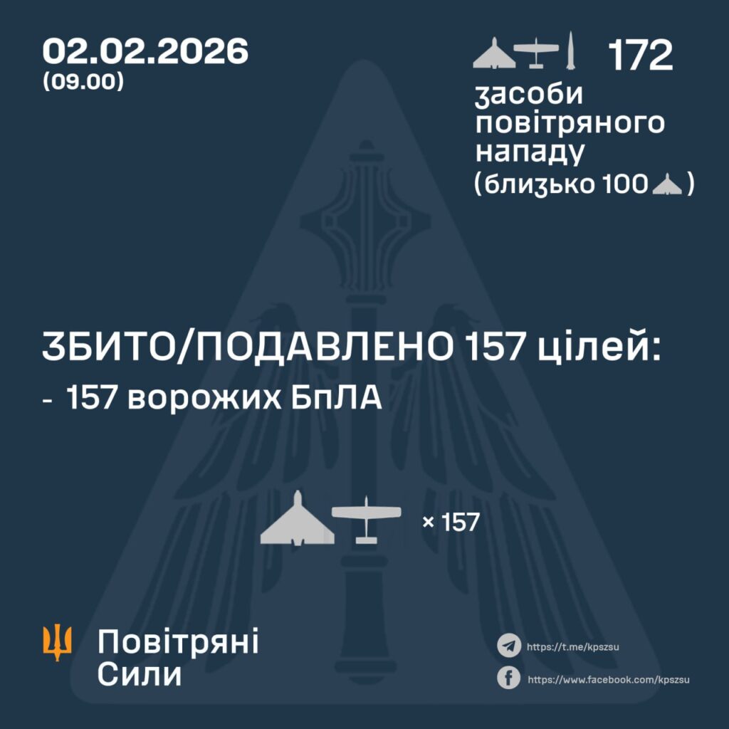 За попередніми даними, станом на 09:00, протиповітряною обороною збито/подавлено 157 ворожих БпЛА типу Shahed, Гербера і дрони інших типів на півночі, півдні та сході країни.
