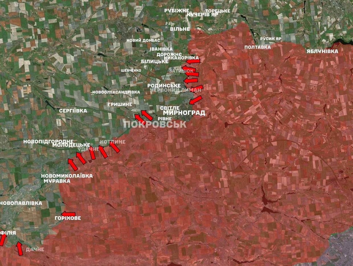 На Покровському напрямку наші захисники зупинили 48 штурмових дій агресора поблизу населених пунктів Родинське, Мирноград, Котлине, Удачне, Молодецьке, Світле, Філія та в бік населених пунктів Білицьке, Новоолександрівка, Новопідгородне, Новопавлівка, Шевченко, Гришине.