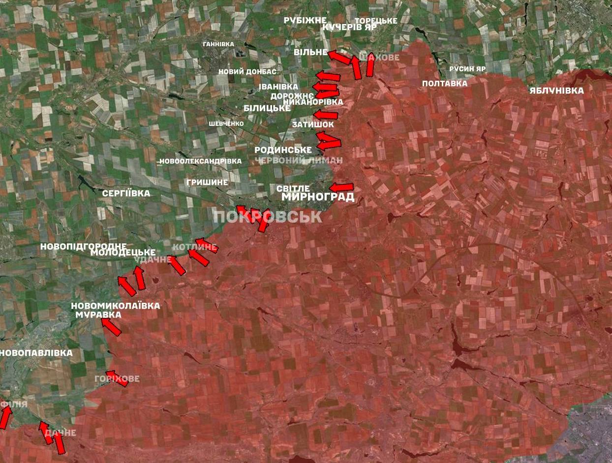 На Покровському напрямку наші захисники зупинили 72 штурмові дії агресора у районах населених пунктів Родинське, Покровськ, Котлине, Удачне, Молодецьке, Муравка, Мирноград, Філія та у бік населених пунктів Торецьке, Кучерів Яр, Білицьке, Шевченко, Новоолександрівка, Сергіївка, Новопідгородне, Новопавлівка, Іванівка, Гришине, Новий Донбас.