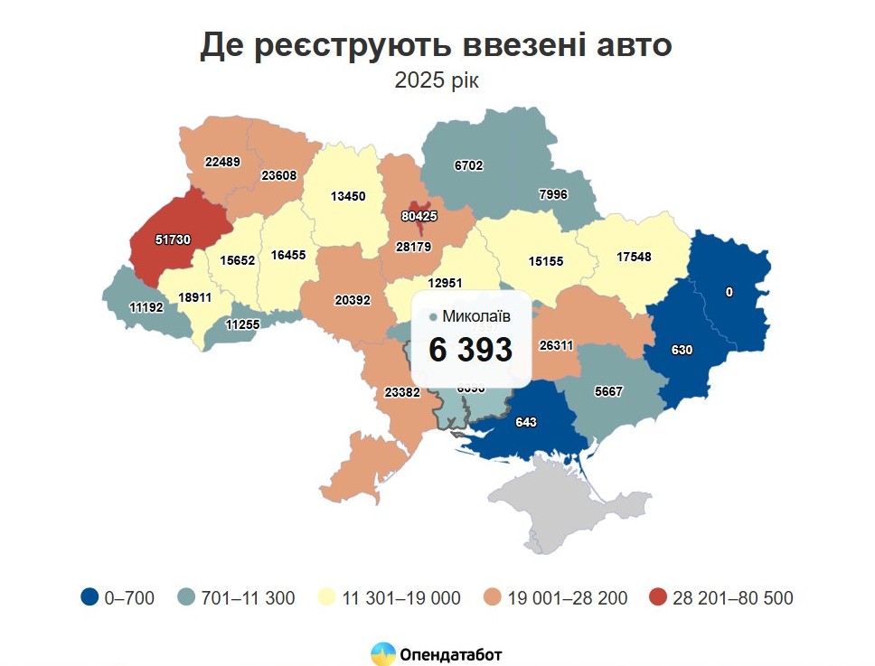 Майже кожен п’ятий ввезений транспортний засіб був зареєстрований у столиці: 80 425 авто. Львівщина утримує друге місце — 51 730 автівок. До п’ятірки лідерів також увійшли Київщина (28 179), Дніпропетровщина (26 311) та Рівненщина (23 608). На Миколаївщині було зареєстровано 6393 ввезених автівок.