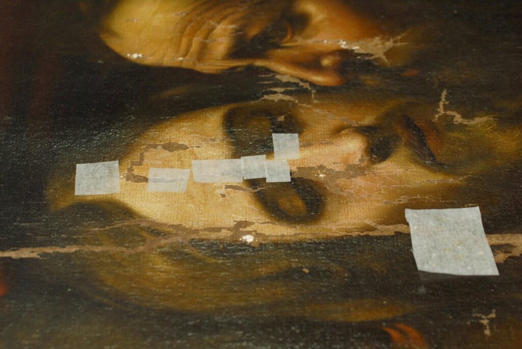Картина надійшла до реставраційного центру у двох частинах — центральна композиція та фрагменти окрайок. Реставратори зафіксували численні втрати фарбового шару, розриви полотна, деформації, пошкодження після варварського вирізання.