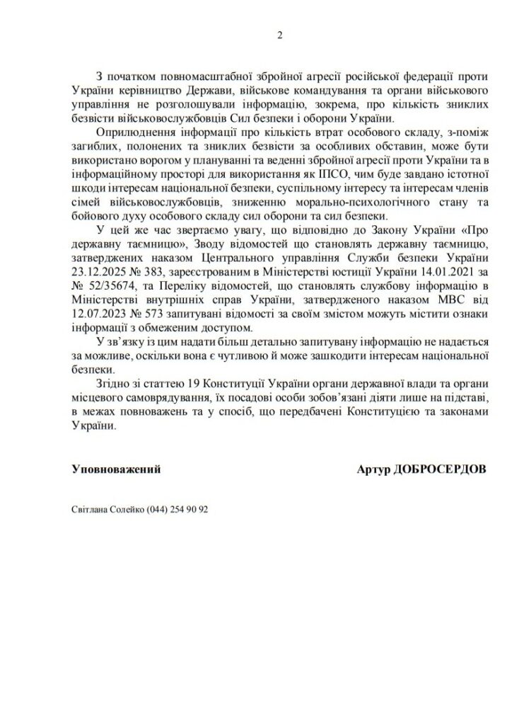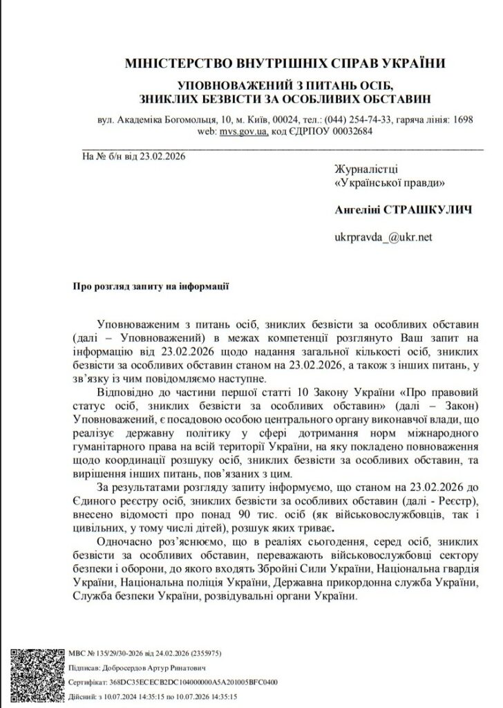 Про це повідомляє «Українська правда» з посиланням на відповідь Уповноваженого з питань осіб, зниклих безвісті за особливих обставин.