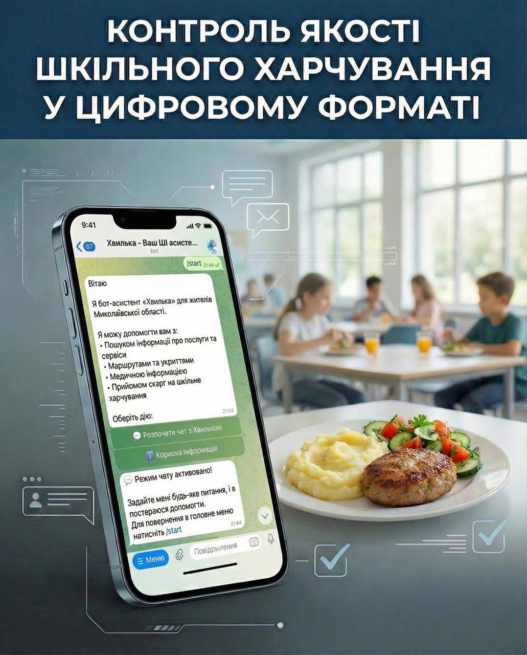 Вже запущено Telegram-бот у межах роботи цифрового асистента «Хвилька» – https://t.me/hvylka_bot. Тепер батьки й учні можуть повідомити про проблему одразу — швидко та зручно.