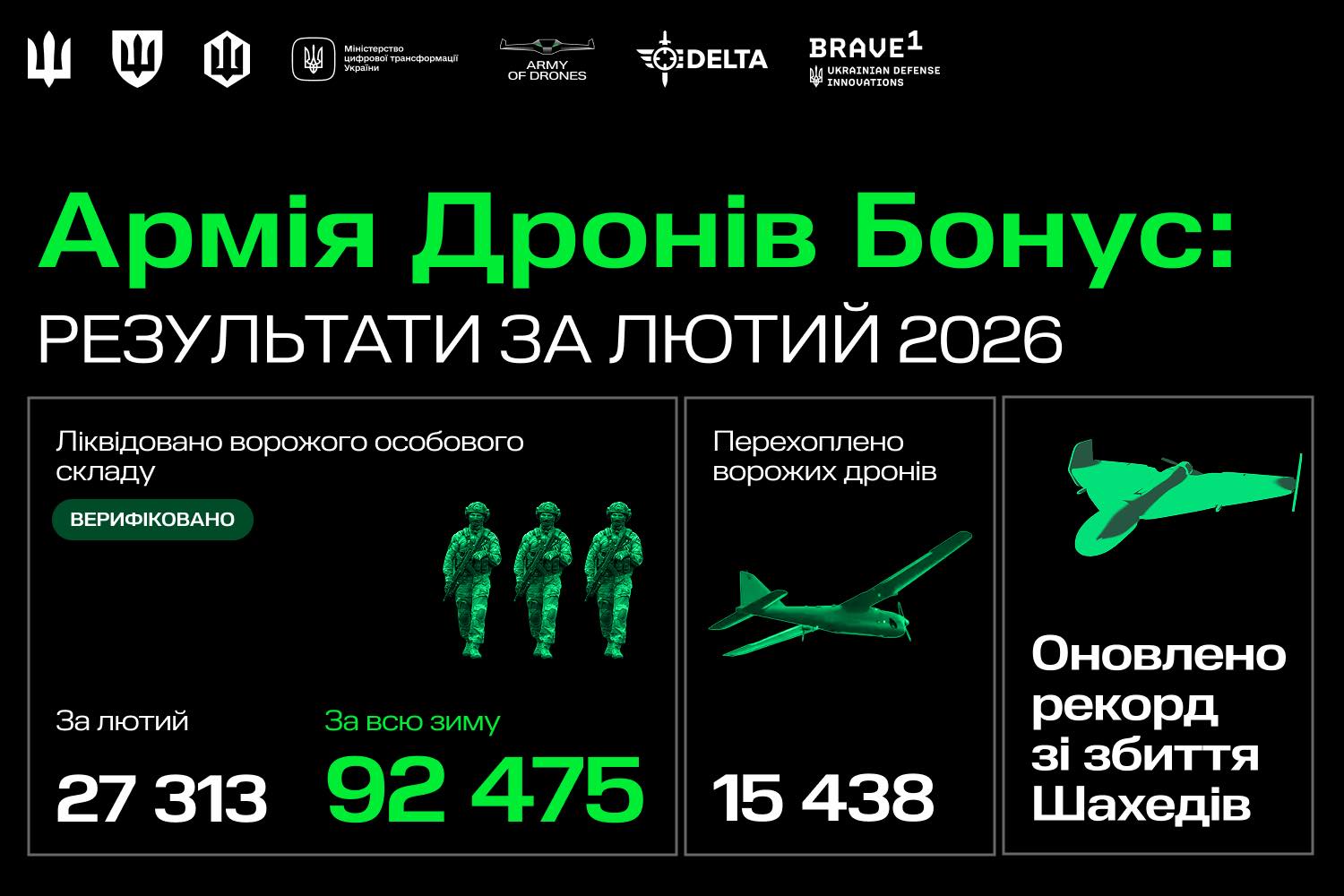 «Цієї зими Сили оборони ліквідували 92 475 російських військових. Дронами — 88 898 окупантів, решта — верифіковані на відео ураження артилерією.