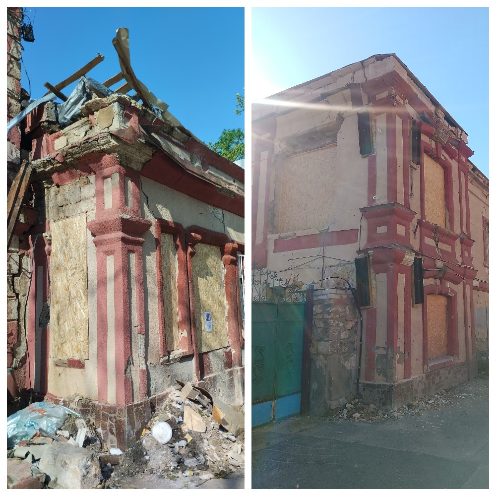 Ця двоповерхова будівля в псевдокласичному стилі з цінним декоративним опорядженням фасаду – пам’ятка архітектури місцевого значення «Житловий будинок прибудинкового типу. Кінець ХІХ-поч. ХХ ст.» або, як її часто називають, – «Будинок Менкіні», який має цікаву історію його мешканців. 20 липня 2023 року ракетний обстріл центру міста значно пошкодив пам’ятку. Був повністю зруйнований дах, вікна, двері, стіни кутової частини головного та бічного фасадів. Будівля негайно потребувала протиаварійних робіт.