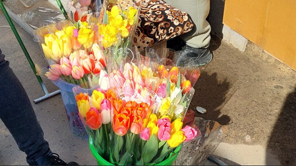 Чесно кажучи, ми не надто переймалися цим питанням, і мета нашого візиту була інша, але коли за квартал до ринку почали зустрічати чоловіків з квітами, згадали – сьогодні ж 8 Березня! І якщо ми вважали, що далі будемо бачити з букетами чоловіків 50+, то ні, чи не першим нам назустріч з 3 червоними трояндами гордо йшов хлопчина років 15.